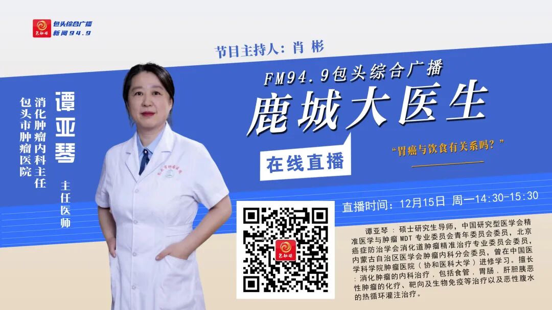 FM94.9包头综合广播12月15日(周一)14:30到15:30播出的《鹿城大医生》节目,将邀请包头市肿瘤医院消化肿瘤内科主任、主任医师——谭亚琴和您一起关注:“胃癌与饮食有关系吗?”欢迎您届时收听参与!