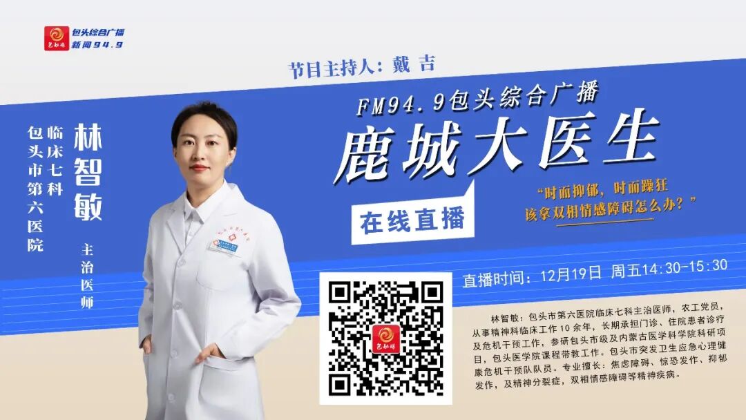 FM94.9包头综合广播12月19日(周五)14:30到15:30播出的《鹿城大医生》节目,将邀请包头市第六医院临床七科——林智敏和您一起关注:“时而抑郁,时而躁狂,该拿双相情感障碍怎么办?”,欢迎您届时收听参与!