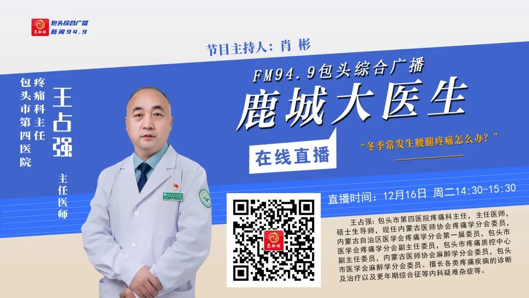 FM94.9包头综合广播12月16日(周二)14:30到15:30播出的《鹿城大医生》节目,将邀请包头市第四医院疼痛科主任、主任医师——王占强和您一起关注:“冬季常发生腰腿疼痛怎么办?”欢迎您届时收听参与!