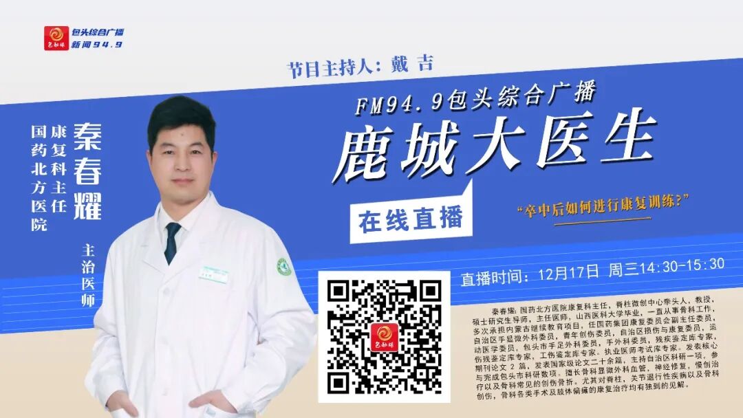 FM94.9包头综合广播12月17日(周三)14:30到15:30播出的《鹿城大医生》节目,将邀请国药北方医院康复科主任——秦春耀和您一起关注:“卒中后如何进行康复训练?”欢迎您届时收听参与!