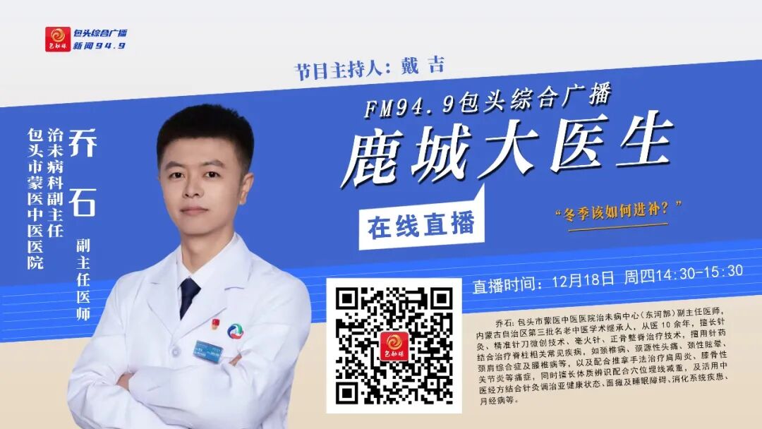 FM94.9包头综合广播12月18日(周四)14:30到15:30播出的《鹿城大医生》节目,将邀请包头市蒙医中医医院治未病科副主任医师——乔石和您一起关注:“冬季该如何进补?”欢迎您届时收听参与!