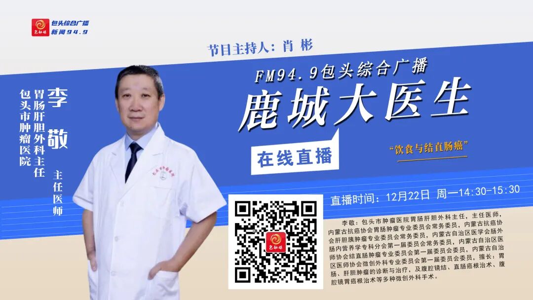 FM94.9包头综合广播12月22日(周一)14:30到15:30播出的《鹿城大医生》节目,将邀请包头市肿瘤医院胃肠肝胆外科主任、主任医师——李敬和您一起关注:“饮食与结直肠癌”欢迎您届时收听参与!