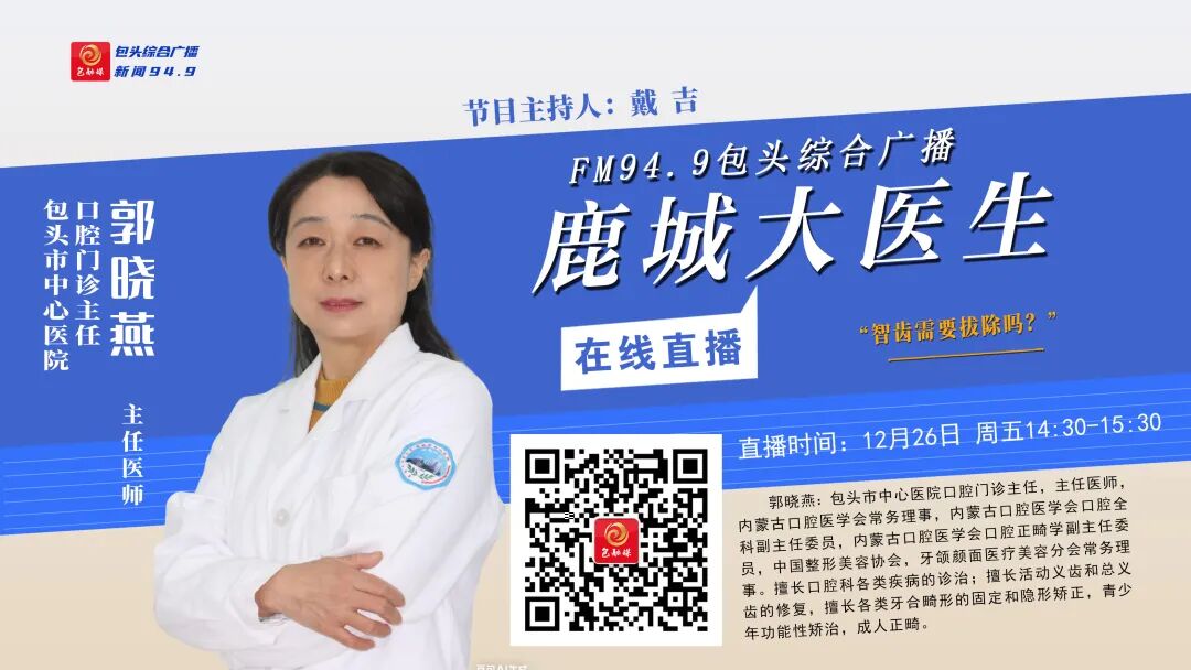 FM94.9包头综合广播12月26日(周五)14:30到15:30播出的《鹿城大医生》节目,将邀请包头市中心医院口腔门诊主任、主任医师——郭晓燕和您一起关注:“智齿需要拔除吗?”,欢迎您届时收听参与!