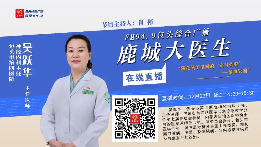 FM94.9包头综合广播12月23日(周二)14:30到15:30播出的《鹿城大医生》节目,将邀请包头市第四医院神经内科主任、主任医师——吴跃华和您一起关注:“藏在脑子里面的‘定时炸弹’——脑血管瘤”欢迎您届时收听参与!