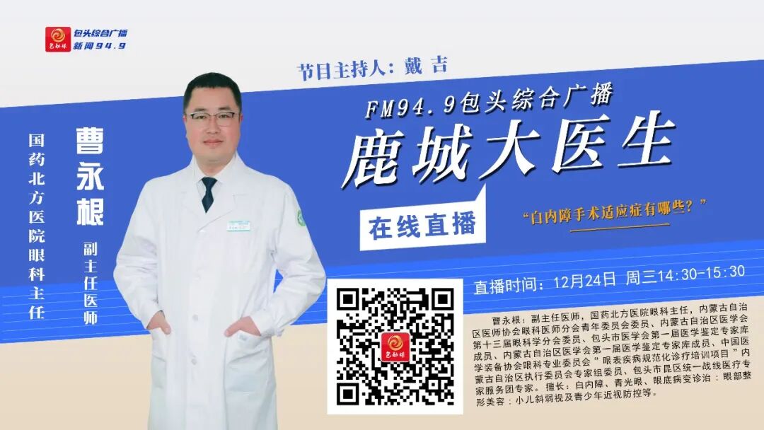 FM94.9包头综合广播12月24日(周三)14:30到15:30播出的《鹿城大医生》节目,将邀请国药北方医院眼科主任、副主任医师——曹永根和您一起关注:“白内障手术适应症有哪些?”欢迎您届时收听参与!