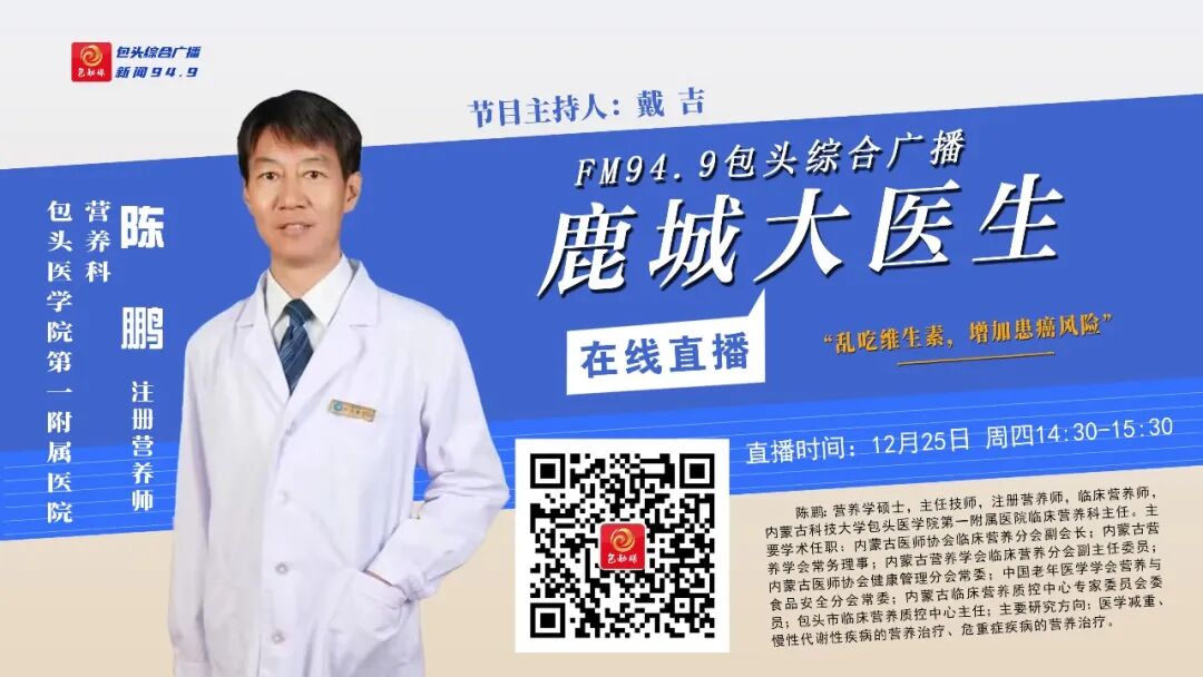 FM94.9包头综合广播12月25日(周四)14:30到15:30播出的《鹿城大医生》节目,将邀请包头医学院第一附属医院营养科主任、注册营养师——陈鹏和您一起关注:“乱吃维生素,增加患癌风险”欢迎您届时收听参与!