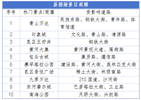 易拥堵热点景区、商圈:“春风十里”主题街区、黄河大集、包头古城、万达、印象城、吾悦广场等景区商圈周边道路将迎来人流、车流高峰,每日9:00-20:00景区停车场、主干道易出现拥堵缓行,建议错峰出行或选择公共交通出行。