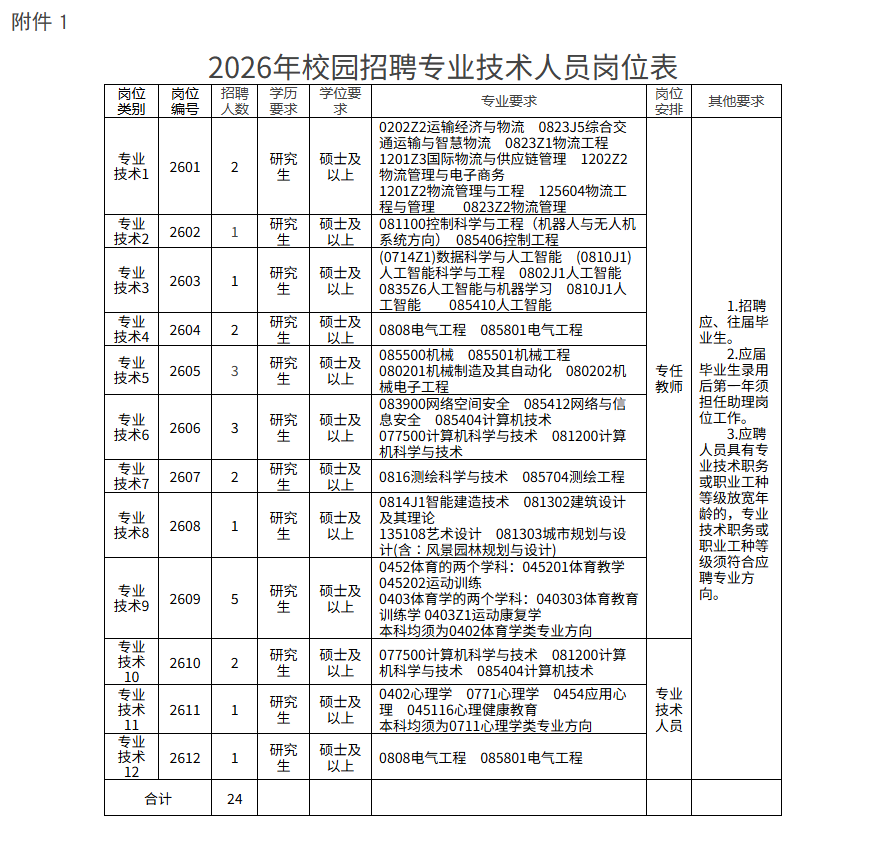 (一)招聘计划:计划招聘专业技术人员24人(详见附件1《2026年校园招聘专业技术人员岗位表》)。