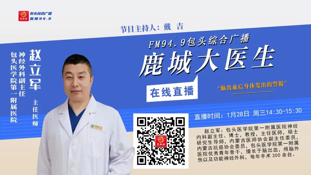 FM94.9包头综合广播1月28日(周三)14:30到15:30播出的《鹿城大医生》节目,将邀请包头医学院第一附属医院神经外科副主任、主任医师——赵立军和您一起关注:“脑出血后身体发出的警报”欢迎您届时收听参与!
