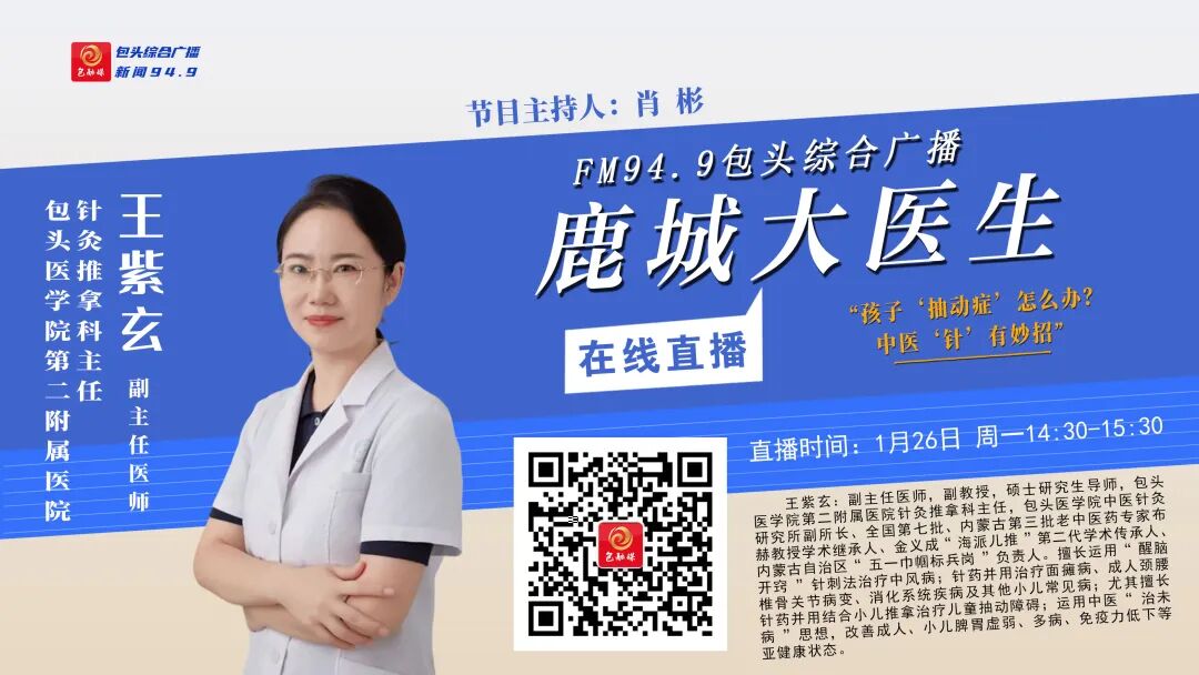 FM94.9包头综合广播1月26日(周一)14:30到15:30播出的《鹿城大医生》节目,将邀请包头医学院第二附属医院针灸推拿科主任、副主任医师——王紫玄和您一起关注:“孩子‘抽动症’怎么办?中医‘针’有妙招”欢迎您届时收听参与!