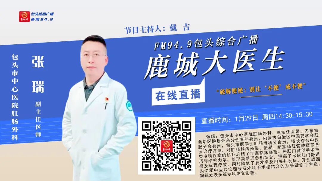FM94.9包头综合广播1月29日(周四)14:30到15:30播出的《鹿城大医生》节目,将邀请包头市中心医院肛肠外科副主任医师——张瑞和您一起关注:“破解便秘:别让‘不便’成不便”欢迎您届时收听参与!