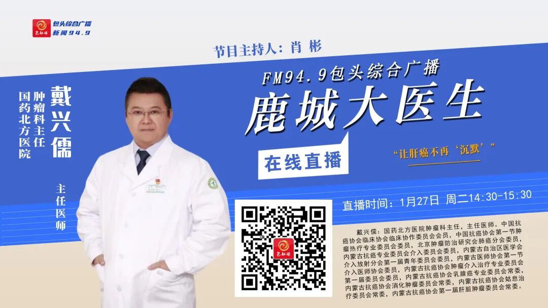 FM94.9包头综合广播1月27日(周二)14:30到15:30播出的《鹿城大医生》节目,将邀请国药北方医院肿瘤科主任、主任医师——戴兴儒和您一起关注:“让肝癌不再‘沉默’”欢迎您届时收听参与!