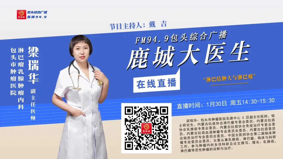FM94.9包头综合广播1月30日(周五)14:30到15:30播出的《鹿城大医生》节目,将邀请包头市肿瘤医院淋巴瘤乳腺肿瘤内科副主任医师——梁瑞华和您一起关注:“淋巴结肿大与淋巴瘤”欢迎您届时收听参与!