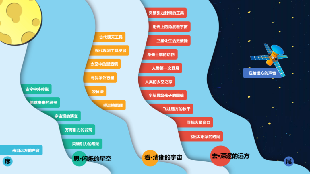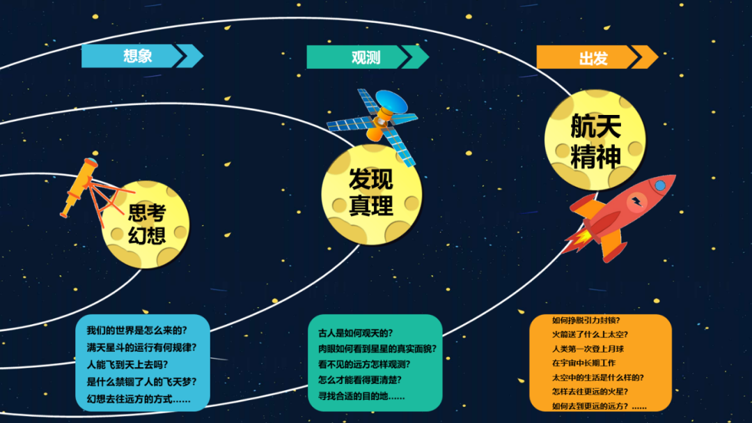 整体按照古今中外关于宇宙的神话和传说引出古人对于宇宙的思考,再到宇宙观的改变、万有引力的发现以及突破引力的理论发现为展示脉络,展示人类从对太空的思考到发现突破引力去往太空的理论这一过程,让大家了解在探索太空的萌芽期,人类是如何看待宇宙的。