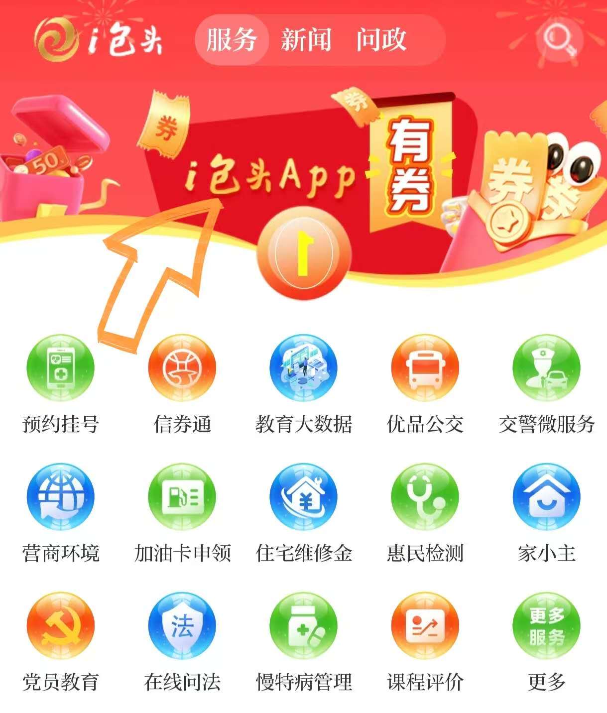 下载“i包头”客户端,进入服务首页点击"有券"平台。