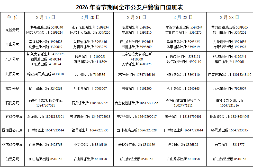 2026年春节期间,为深入推进公安“放管服”改革,落实便民利民服务措施,包头市公安户籍值班窗口于2月15日、2月20日至2月23日,按照正常工作时间为群众办理身份证业务,对前来办事的每一位群众,主动延长服务时间,做到不办完不打烊,不让群众多跑腿。