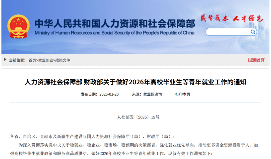 人力资源社会保障部 财政部关于做好2026年高校毕业生等青年就业工作的通知