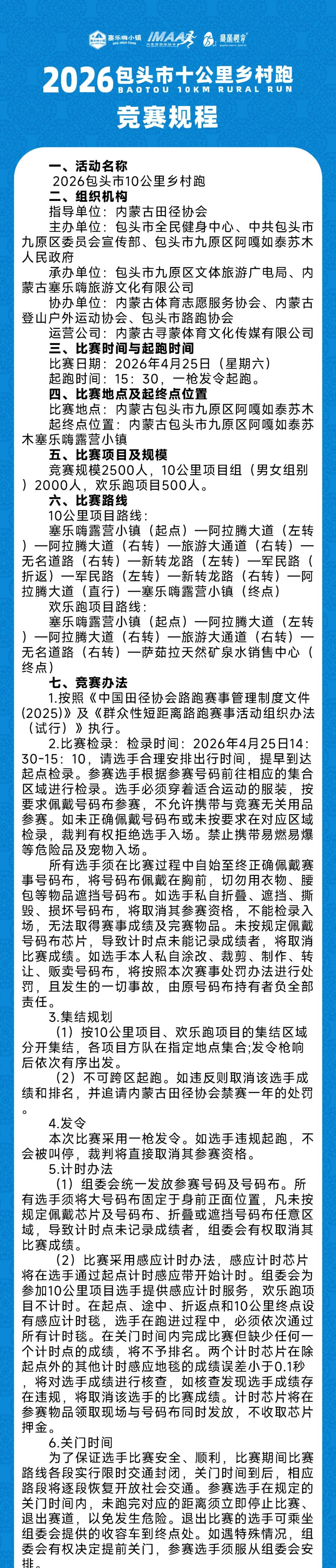 10公里组:塞乐嗨露营小镇(起点)->阿拉腾大道(左转)->阿拉腾大道(右转)-> 旅游大通道(右转)->无名道路(右转)->新转龙路(左转)->军民路(折返)->军民路(左转)->新转龙路(右转)->阿拉腾大道(直行)-> 塞乐嗨露营小镇(终点)