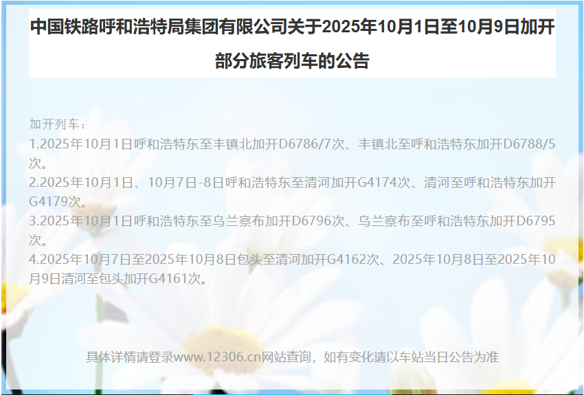 中国铁路呼和浩特局集团有限公司发布关于2025年10月1日至10月9日加开部分旅客列车的公告。详情