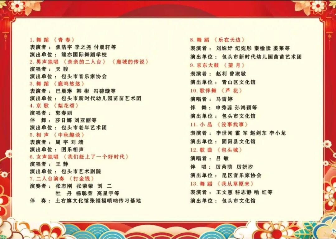 本次盛典精心策划,节目丰富多彩,既有彰显时代气息的现代佳作,也有植根本土的传统文化瑰宝,力求为英才们打造一场高水准、有温度、接地气的视听享受。“包揽人才”是“头等大事”,是重振包头雄风的核心支撑。本次中秋专场演出,是我市优化人才发展环境、提升人才服务温度的切实举措之一。希望通过这样一场精心筹备的文化盛典,让每一位为包头发展贡献智慧与汗水的人才,都能感受到这座城市的真心实意与尊崇礼遇。