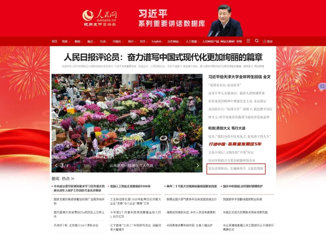 人民网首页聚焦固阳县双节文旅盛宴。秦长城国家文化公园内,开城门仪式、“蒙恬巡城” 沉浸式上演,古风与欢庆交融。春坤山游园、马鞍岭赏秋、怀朔镇品文脉,自然与人文相映。“芪” 享欢乐购助特色产业,固阳以文旅之力让家国团圆情在山水间扎根。详情