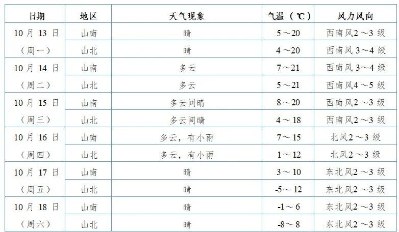 10月13日全市晴。西南风3~4级,山南气温6℃~18℃,山北气温4℃~15℃。13日夜间至14日白天全市晴转多云。