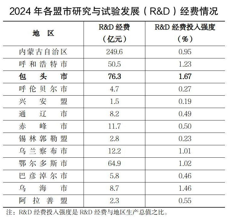 2024年,包头市R&D经费76.3亿元,位居全区第一,占全区比重为30.6%;R&D经费占地区生产总值比重(投入强度)为 1.67%,位居全区第一,高于全区平均水平(0.95%)0.72个百分点,低于全国(2.69%)1.02个百分点。包头市R&D经费总量及投入强度在全区十二个盟市中继续保持了“双第一”。