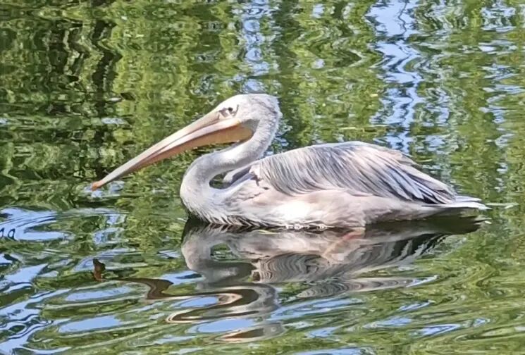身份卡:大型水鸟,体长1米以上,全身灰白,头顶有卷卷的羽冠,最显眼的是橘红色大喉囊,嘴尖还带点黄色弯钩;国家一级保护动物;目前是“旅鸟”,停留10-15天左右会继续南飞。
