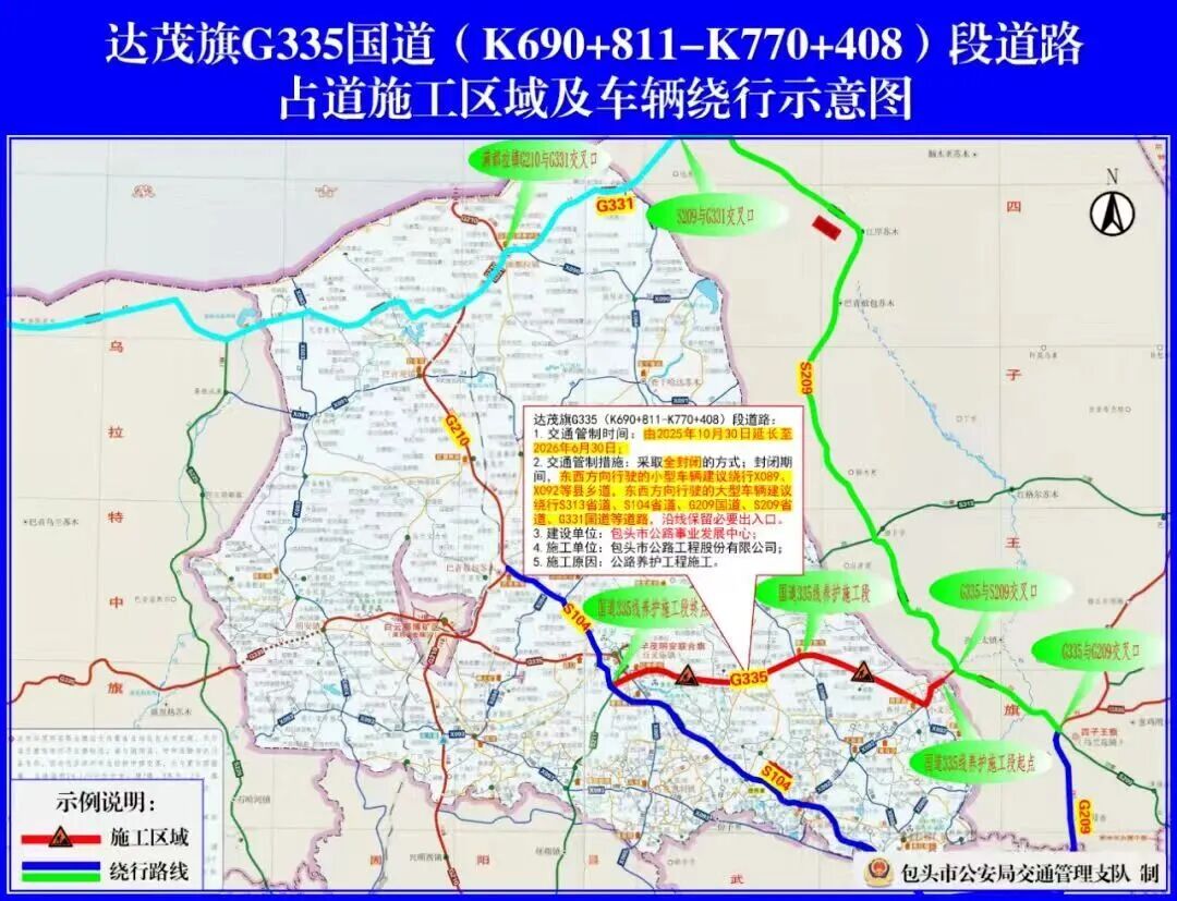由包头市公路事业发展中心组织实施的达茂旗国道335线公路养护工程,因工程工序复杂、施工难度较大,且受恶劣天气等不可抗力因素影响,原定于2025年10月30日结束的交通管制,延长至2026年6月30日。详情