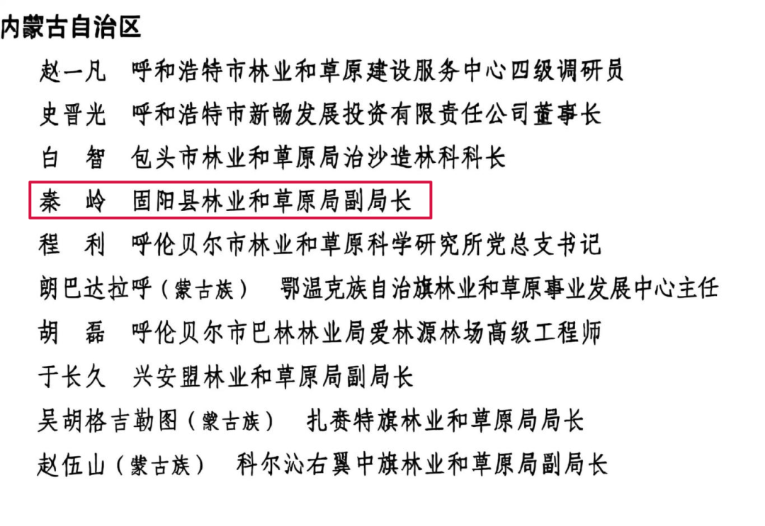 日前,全国绿化委员会印发关于表彰全国绿化模范单位和颁发全国绿化奖章的决定,固阳县林业和草原局副局长秦岭荣获全国绿化奖章荣誉称号。详情