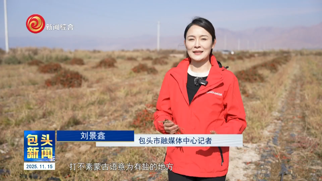 包头市融媒体中心记者 刘景鑫:我现在就在九原区的打不素村,打不素蒙古语意为有盐的地方,这名字可没有半分虚言,刚进地里我们就看到了一层白色的盐霜,就在这每公斤含盐量超3克、pH值达到8.5的盐碱地上,竟然种出了密密麻麻的红辣椒,走,我们去一探究竟。
