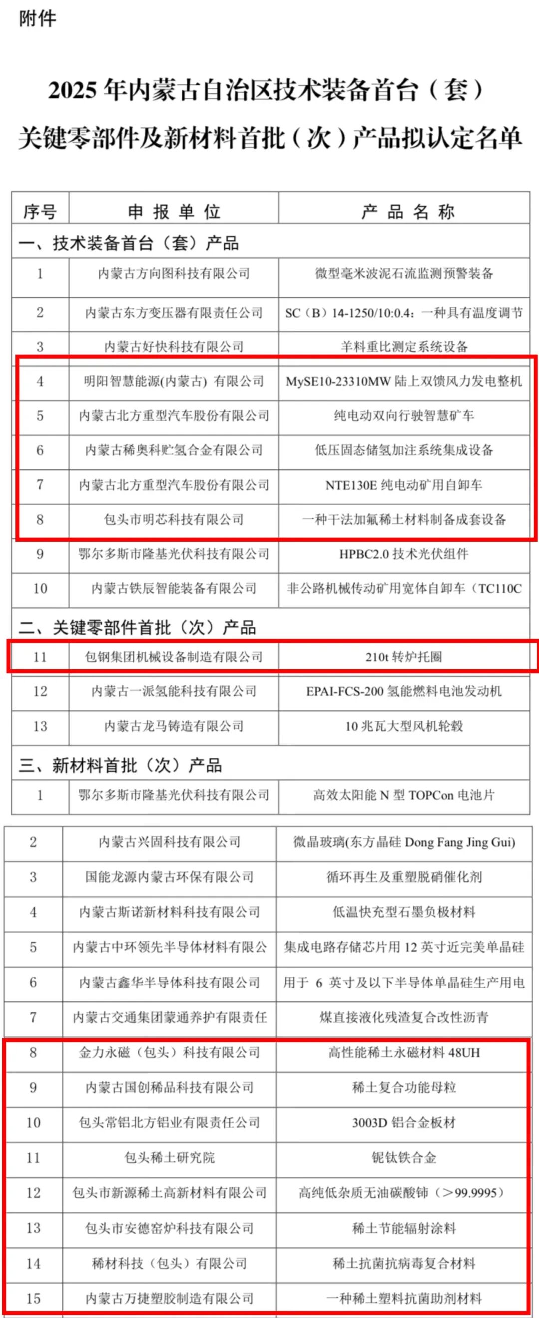 11月24日自治区工信厅公示了2025年内蒙古自治区技术装备首台(套)关键零部件及新材料首批(次)产品拟认定名单我市共14家企业入选其中,技术装备首台(套)5户,关键零部件首批(次)1户,新材料首批(次)8户占比50%,为全区第一