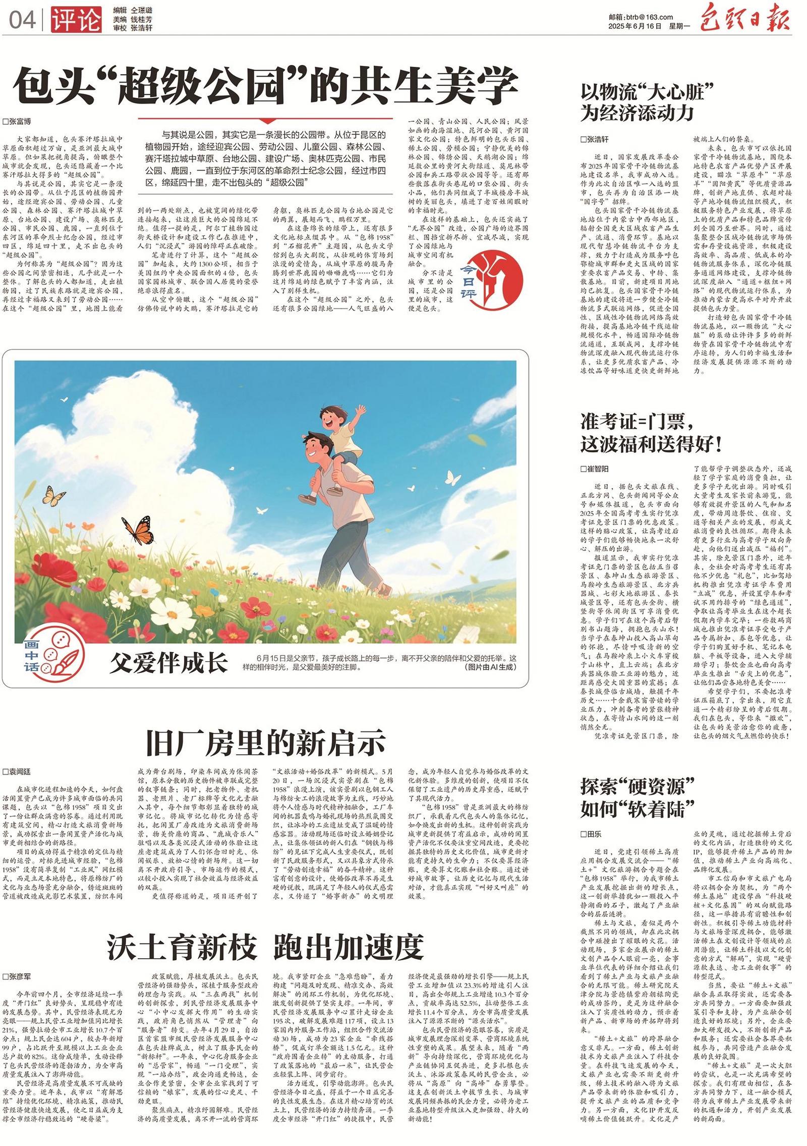 这座公园的独特之处在于“无界”与“共生”。通过拆除围栏,公园与城市街道有机融合,形成“半城楼房半城树”的格局。绿色之中,更穿插着“包棉1958”、大剧院、爱情岛等人文景观,自然生态与城市记忆在此交织,为绵延的绿色注入了丰富内涵与别样生机。这不仅是生态建设的成就,更是城市发展理念的体现。它让公园不再是城市的点缀,而是与城市空间呼吸与共的有机整体。在这里,人们已分不清是城在园中,还是园在城里——这份浑然一体的共生之美,正是包头美好人居环境的生动诠释。(2025年6月16日 4版)