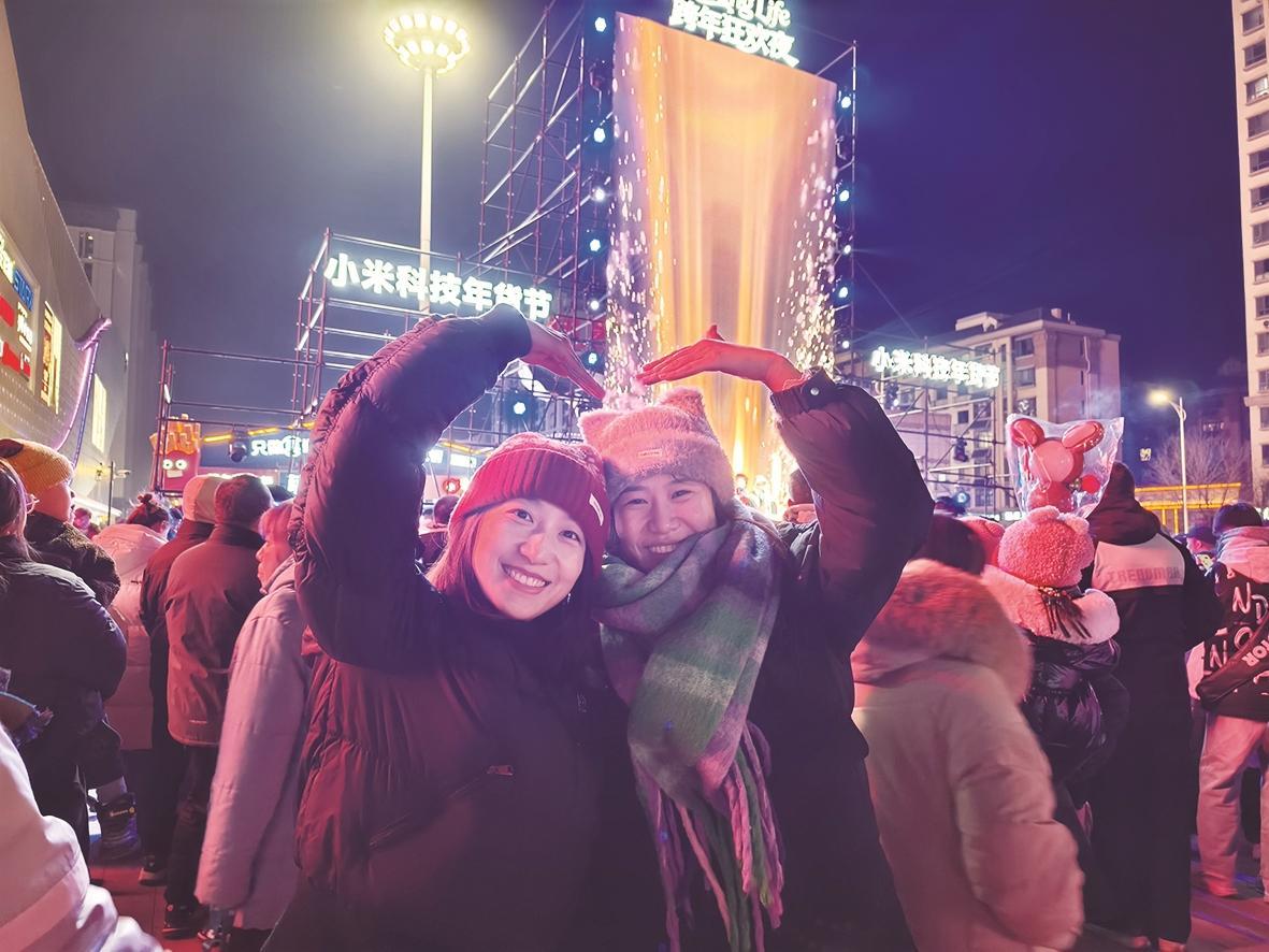 市民在跨年音乐节现场和朋友合影。 记者 岳宇乐 摄