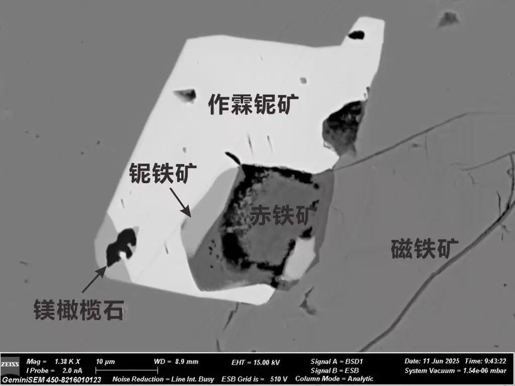 显微镜下,与磁铁矿、铌铁矿、镁橄榄石和赤铁矿等矿物共生的作霖铌矿背散射图像