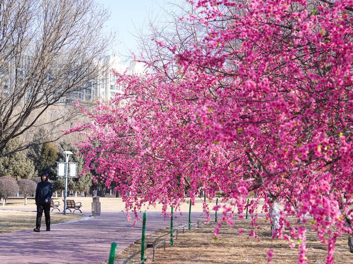 1月6日,我市银河广场的树木缀满粉色“桃花”,恍如春日降临。鲜艳的“桃花”在阳光下格外醒目,为冬日的城市街头添上一抹亮色。
