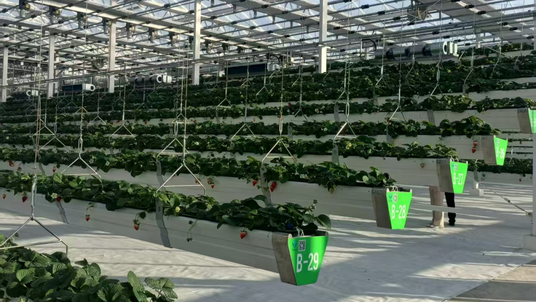 据悉,草莓园引入数字化管控技术,采用可升降高架种植方式,配备一键追光系统,园中新风系统可不断调节湿度与二氧化碳浓度,草莓种植全程已实现不用土培、不洒农药,灌溉用水也经过多重处理,实现标准化生产。这些绿色、环保、科技感十足的举措极大提高了草莓的产量和品质,园中草莓年产量预计可达3000-4000斤。