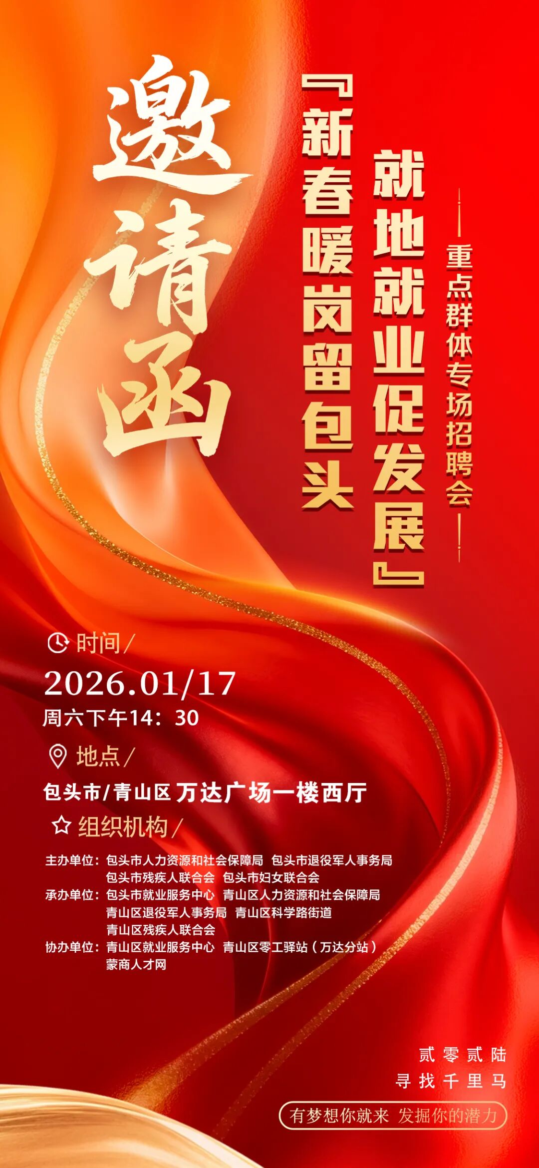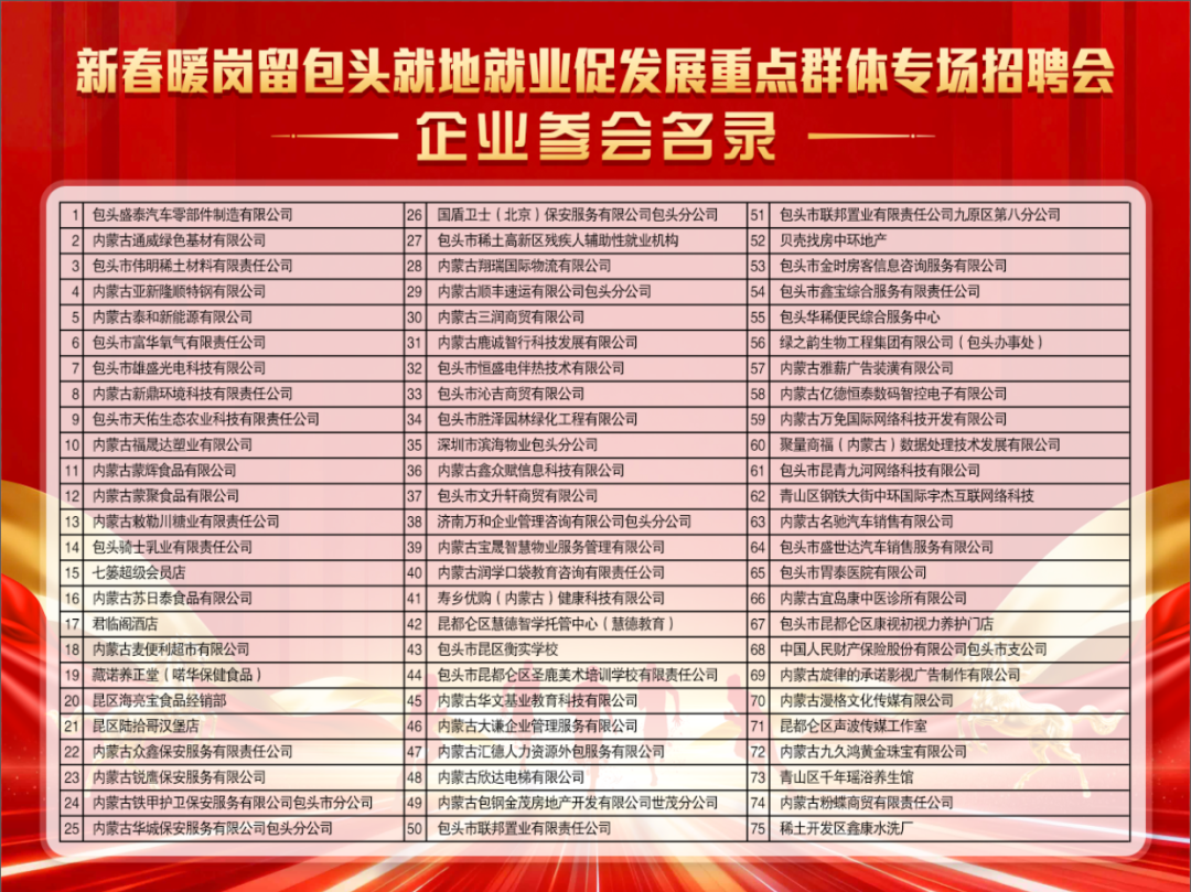 新春伊始,就业先行!为助力重点群体就地就业,由市人社局会同市退役军人事务局、市残联和市妇联等多部门联合举办的“新春暖岗留包头 就地就业促发展”重点群体专场招聘会,将于1月17日(本周六)14:30在青山区万达广场一楼西厅火热启幕。