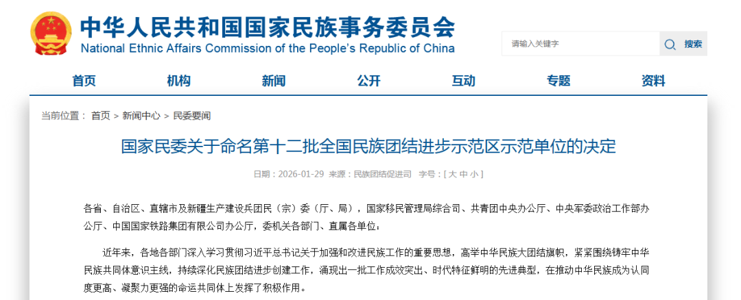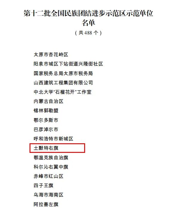 近日,国家民委印发《关于命名第十二批全国民族团结进步示范区示范单位的决定》,共命名488个先进典型。内蒙古自治区共有23个地区和单位成功入选,其中包头市土右旗榜上有名,获评第十二批全国民族团结进步示范区示范单位,命名有效期为5年。这是土右旗在民族团结进步事业中获得的又一项国家级荣誉,也标志着当地铸牢中华民族共同体意识工作迈上了新台阶。