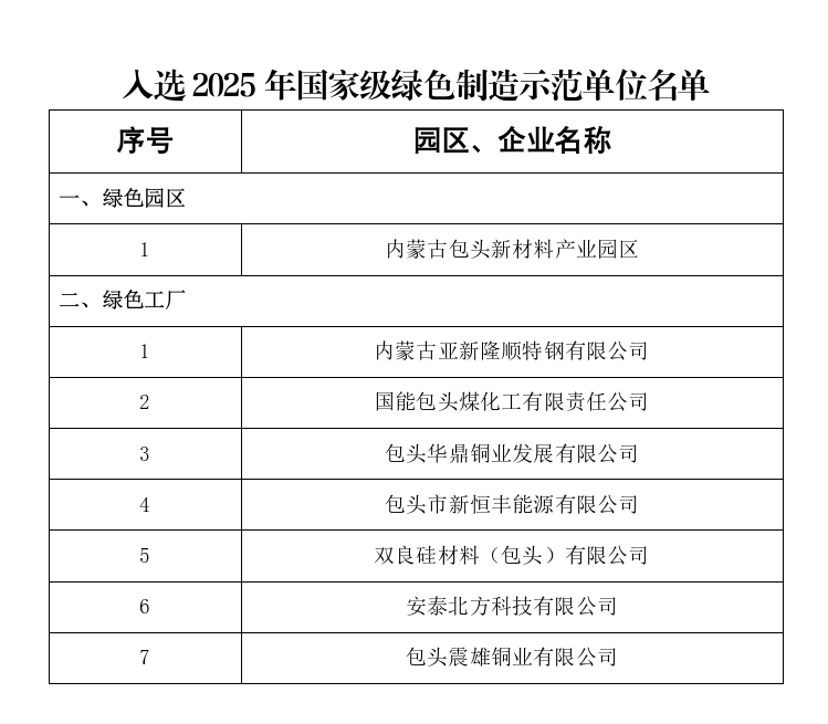 2月5日,工信部公示2025年度国家级绿色制造名单,全区共有2个绿色园区、33户绿色工厂入选,包头市表现突出,共有1个绿色园区、7户绿色工厂入选。截至目前,包头市累计创建国家级绿色园区6个,绿色工厂35户,数量均居全区首位。