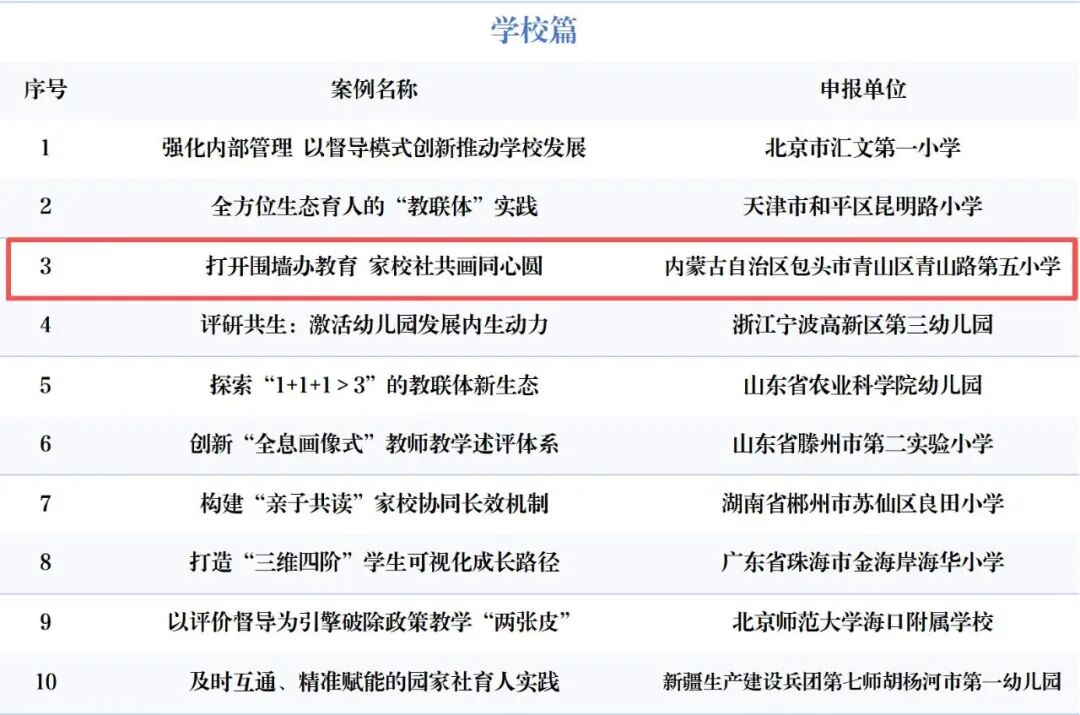 近日,中国教育报刊社公布2025年中国基础教育创新案例,全国遴选出十大类别共200个基础教育创新案例(区域案例100个、学校案例100个),其中,我市青山区青山路第五小学案例《打开围墙办教育 家校社共画同心圆》入选,一起来看→