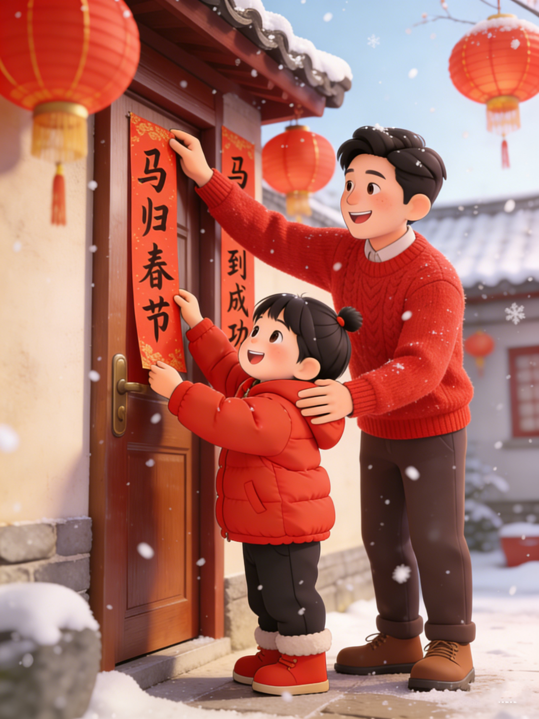 年三十一大早,人们就起来贴对联。贴对联很关键,老包头人叫“贴对子”。对联分为上下联,讲究声律相对,因果相连。贴对联首先要把门窗上的旧糨糊铲掉,然后用白面加食盐在火炉上熬制糨糊,用刷子将糨糊涂抹在对联背面,这时候需要快速地把对联贴到指定的地方,否则在天寒地冻的北方,糨糊会被马上冻干。在老包头有“纸糊大年”的说法,窗花、大字、对联、灯笼都是纸做的,五彩缤纷的纸张渲染着祥瑞的气氛。驻足在大门口阅读对联也是一种享受,“占天时地利人和,取九州四海财宝”,“精耕细作丰收岁,勤俭持家有余年”,红红的对联,透着红红的喜庆。