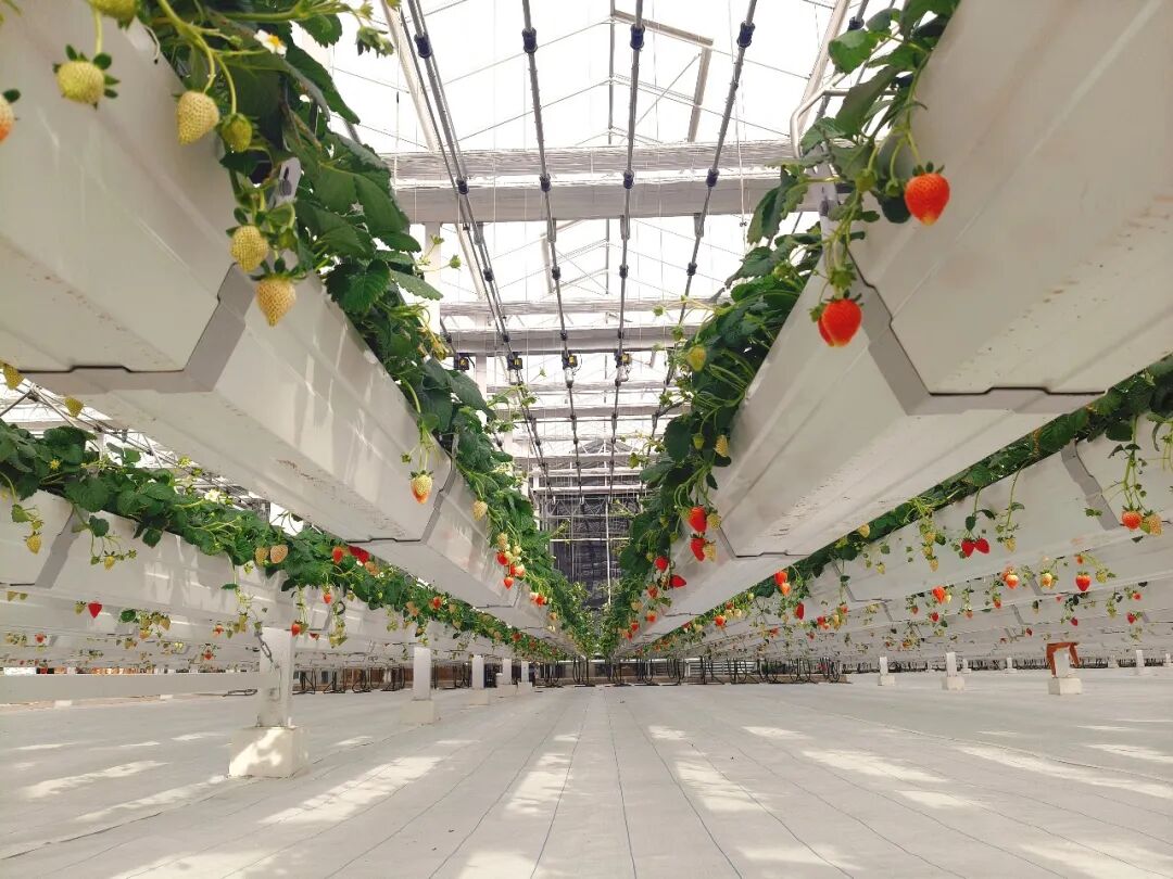 推门而入,草莓果香扑面而来,阳光透过温室洒下,洁净明亮的园区里,草莓天瀑顺势垂落,可塑拱形、梯形,层层叠叠、红绿相映,宛若流动的绿云红珠,兼具科技感与观赏性,一步一景皆是诗意与鲜甜。