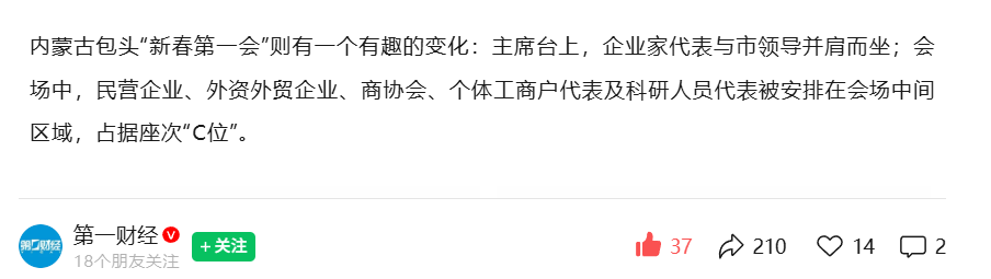 商业财经媒体第一财经在《全国多地召开“新春第一会”》中,也提到包头,认为包头“新春第一会”让企业家坐在会场“C位”是一个“有趣的变化”。