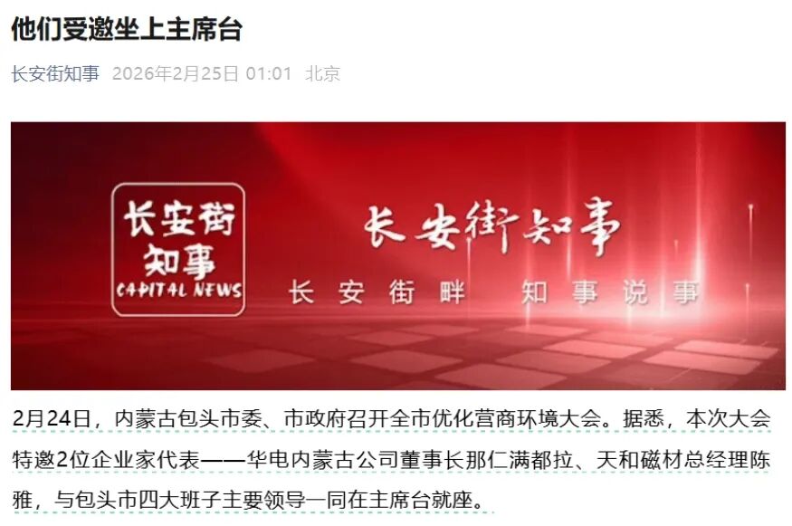 知名时政新媒体“长安街知事”在《他们受邀坐上主席台》的报道中提到了包头“新春第一会”,关注了2位企业家代表与包头市四大班子主要领导一同在主席台就座以及90位各类企业代表在主会场中央就座的细节。