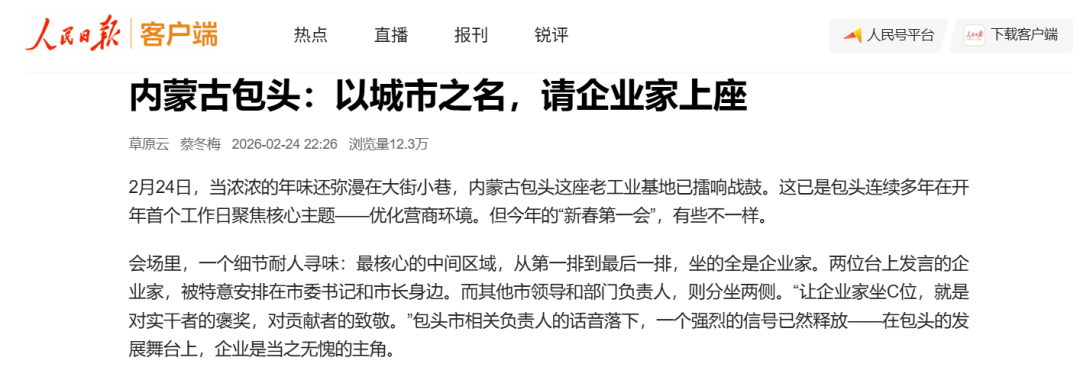 人民日报客户端以《内蒙古包头:以城市之名,请企业家上座》为题,聚焦“座次之变”背后的“观念之变”的深层意义,凸显包头尊商重企的鲜明态度和优化营商环境的坚定努力。