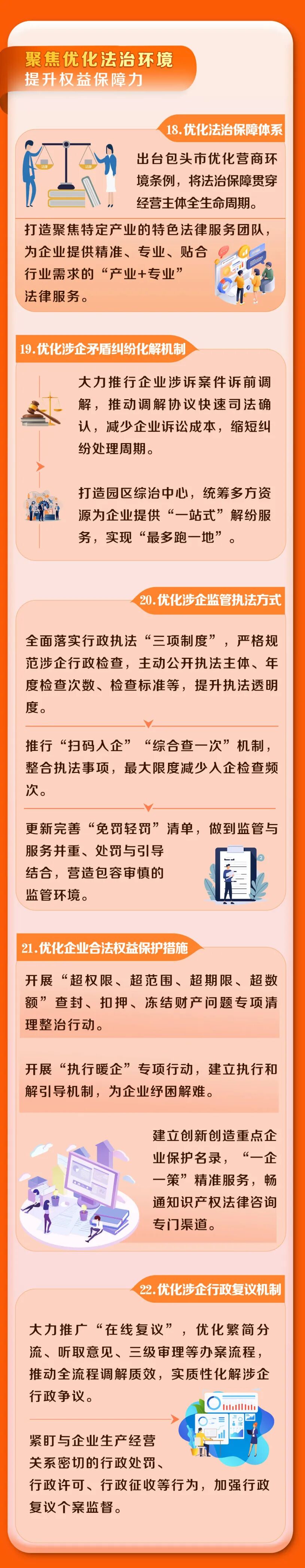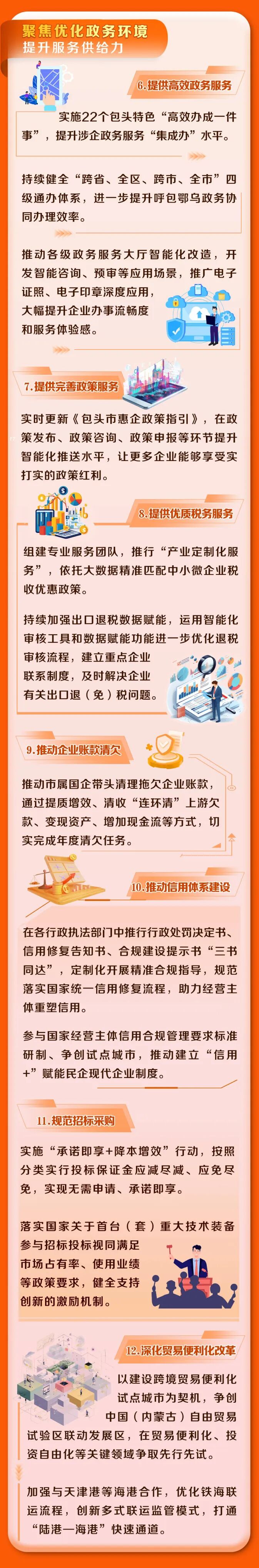 《方案》围绕建设“1144”现代化产业体系,全面贯彻落实自治区营商环境质量提升年工作要求,锚定“全区最优、全国一流”,立足“五聚焦”,制定营商环境25条,实现“五提升”,持续擦亮“包你满意、包你放心”营商环境品牌,全力推动包头高质量发展。