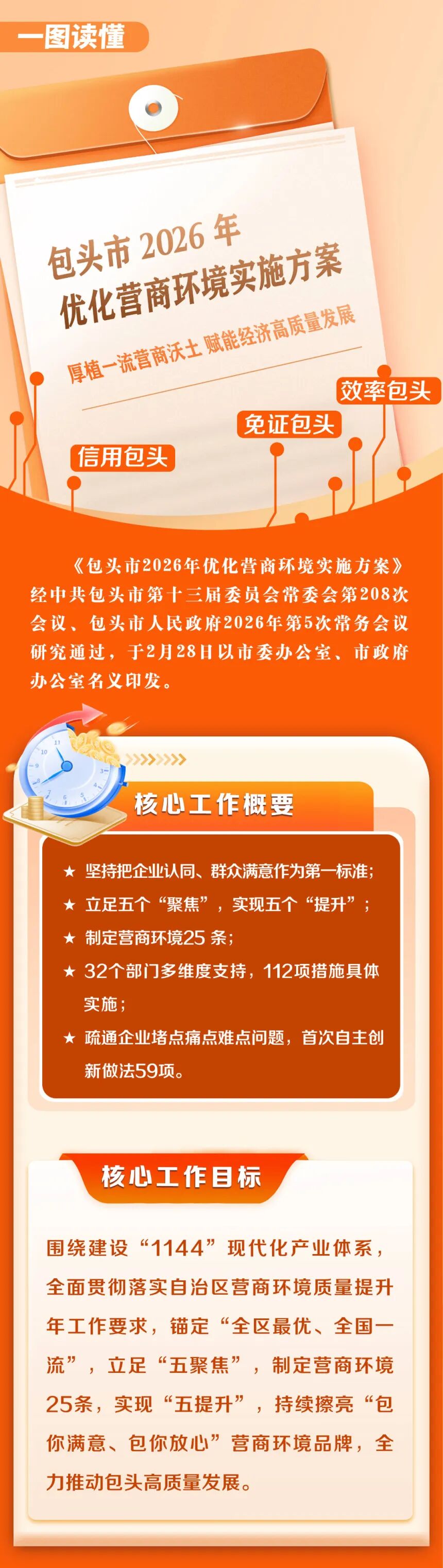 日前,包头市委办公室、市政府办公室正式印发《包头市2026年优化营商环境实施方案》。