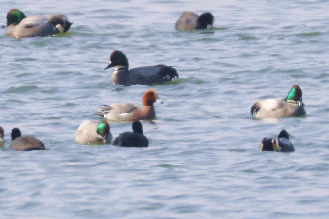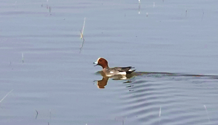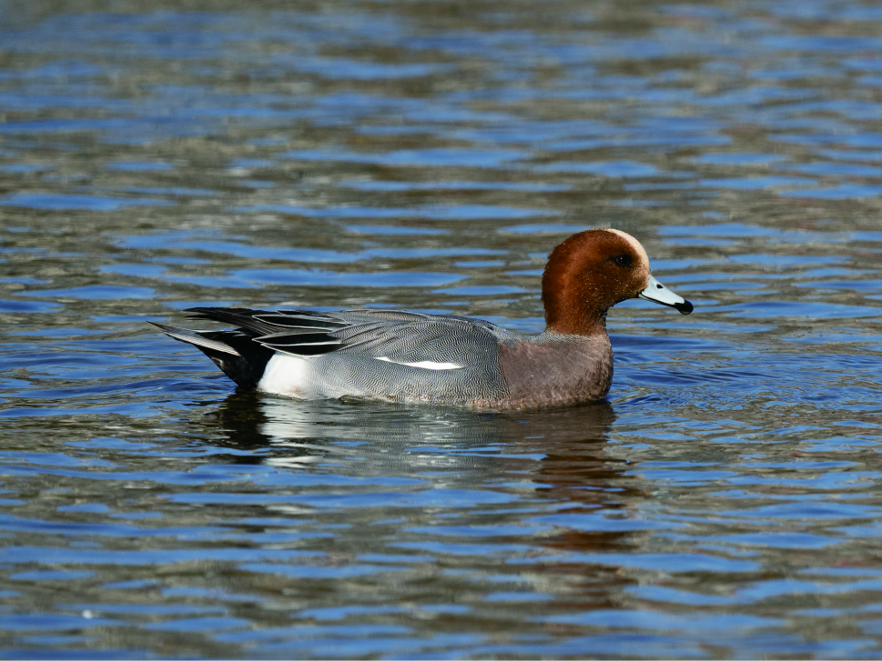 在这些翩跹而至的候鸟中,有一种身姿优雅的鸭类格外引人注目,每年来到包头黄河湿地的数量不多,它是春日湿地的稀客——赤颈鸭。赤颈鸭(Mareca penelope),体长约40—52厘米,属于中型鸭类,雌雄羽色差异显著,是野外辨识的关键依据。繁殖期雄鸟是湿地里的“颜值担当”,头、颈部呈现浓郁的棕红色,头顶点缀着明亮的金黄色,如同戴上了一顶暖金色小帽;胸部为柔和的灰棕色,两胁与背部则是灰白色基底,密布着白色细纹,翼镜在阳光下泛着鲜亮的绿色光泽,飞行时格外醒目。雌鸟羽色相对低调,上体以棕褐色为主,背部带有鳞片状斑纹,两胁呈温暖的棕黄色,翼镜为灰褐色,与雄鸟的艳丽形成鲜明对比。