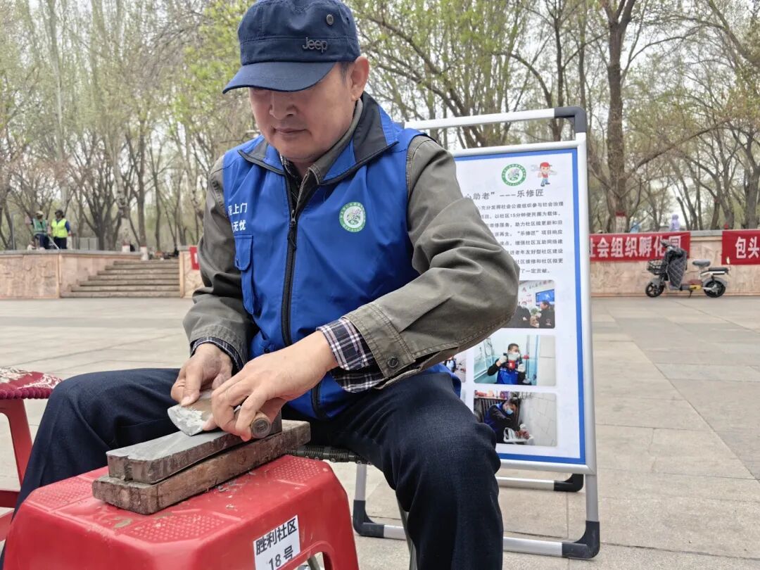 乐修团的师傅们忙着为居民提供家电维修、磨刀、理发等服务,工具摆放整齐,服务有条不紊。“我的刀钝了,磨一下”,师傅技术娴熟、服务周到,很快就解决了居民的难题。